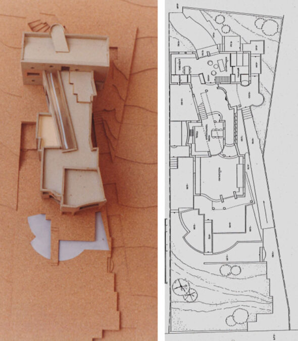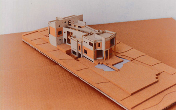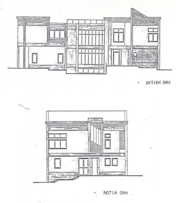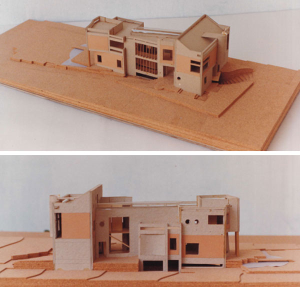 Η κατοικία προσαρμόζεται στο επίμηκες σχήμα του οικοπέδου έτσι ώστε να αφήνει μεγάλα ελεύθερα τμήματα του οικοπέδου εμπρός και στο πλάι. Στο ισόγειο τοποθετούνται: ένα ευρύ καθιστικό με τζάκι και η τραπεζαρία, επίσης μαγειρείο-αποθήκη, ένας καθημερινός χώρος και ο ξενώνας. Στον όροφο τοποθετούνται οι ιδιωτικοί χώροι γονέων και παιδιών και η βιβλιοθήκη. Στο υπόγειο οργανώνονται βοηθητικοί χώροι.