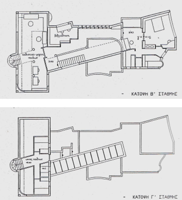 Η κατοικία προσαρμόζεται στο επίμηκες σχήμα του οικοπέδου έτσι ώστε να αφήνει μεγάλα ελεύθερα τμήματα του οικοπέδου εμπρός και στο πλάι. Στο ισόγειο τοποθετούνται: ένα ευρύ καθιστικό με τζάκι και η τραπεζαρία, επίσης μαγειρείο-αποθήκη, ένας καθημερινός χώρος και ο ξενώνας. Στον όροφο τοποθετούνται οι ιδιωτικοί χώροι γονέων και παιδιών και η βιβλιοθήκη. Στο υπόγειο οργανώνονται βοηθητικοί χώροι.